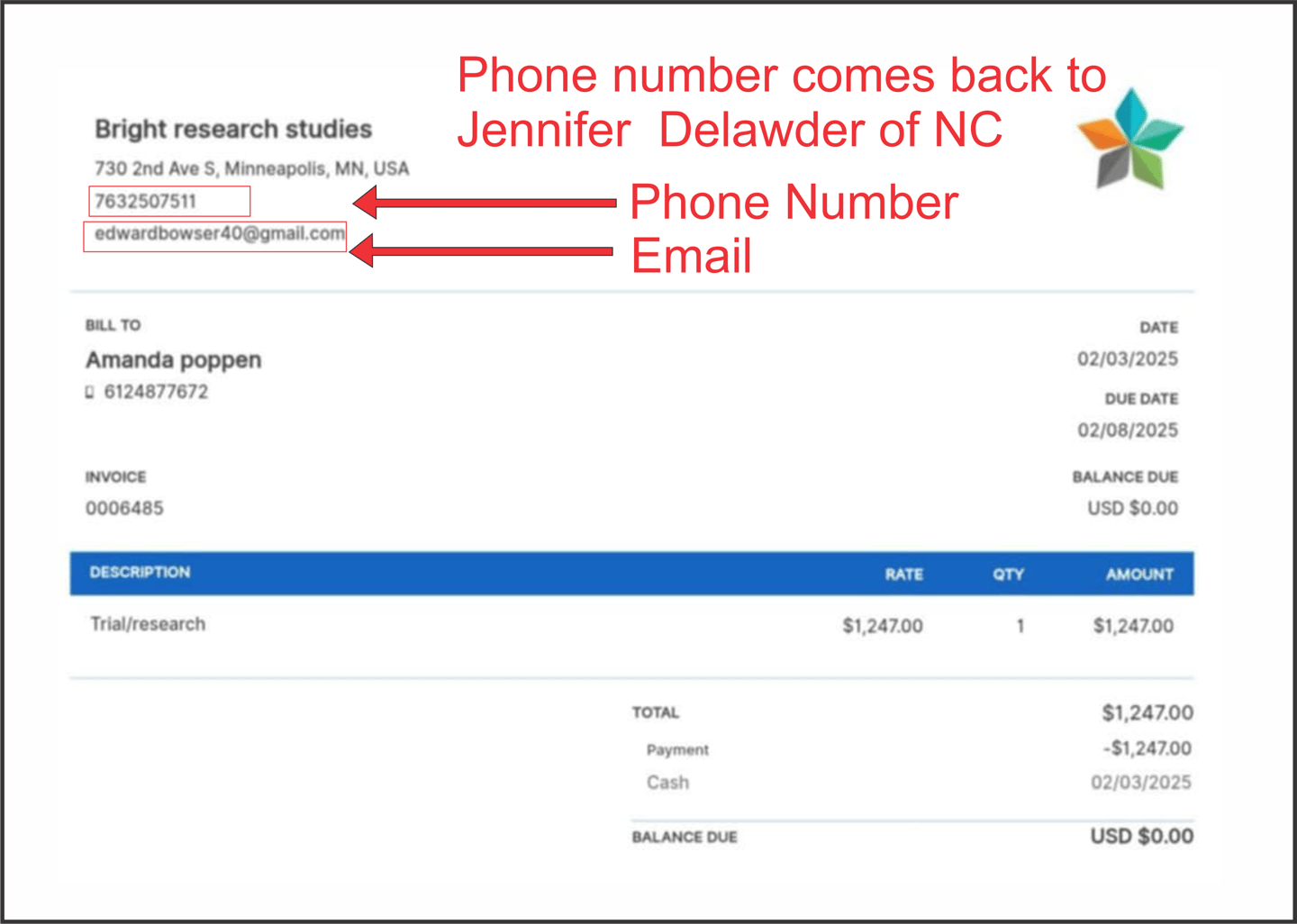 Poppen, along with accomplices Jennifer Delawder, Jennifers Husband Geoffery (Rick) and Edward Bowser, uses falsified medical documents and emotional manipulation to solicit money. When contacted, an alleged representative of Bright Research Studies—who identified himself as Jennifer Delawder’s husband—falsely confirmed the story, claiming he was an assistant at the facility and that Amanda had signed waivers allowing him to discuss Bella’s condition. He reinforced the scam by expressing sympathy, stating Bella "pulled at his heartstrings."